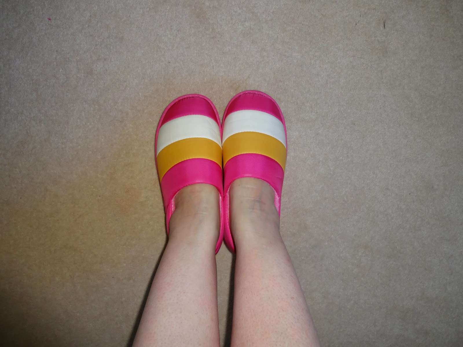 onmygogo.com a footwear wholesaler based in Hong Kong. I'm a UK size 7 and have been sent the large size which is 40-41. The main colour is pink with yellow & white stripes on the upper part of the slipper. The outside of the slipper is a synthetic material probably nylon or similar and the inside is soft & snugly pink fleece. They have a thick patterned sole, and I think they'll be great for wearing outside, they are not outdoor shoes but good if you are popping back & forth to the garden or to your out houses etc. They are a snug fit as the top of the slipper is quite long, however once they are on they are very light weight and comfortable, they will certainly keep my feet nice & warm during our British winter.
