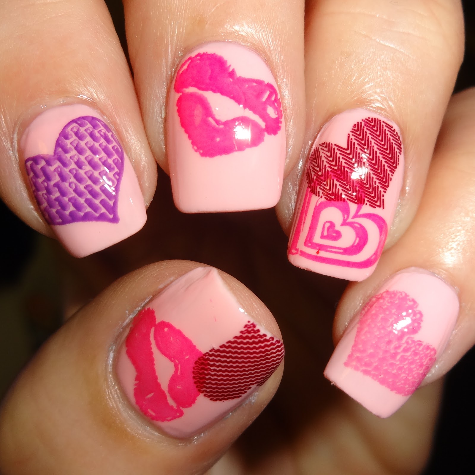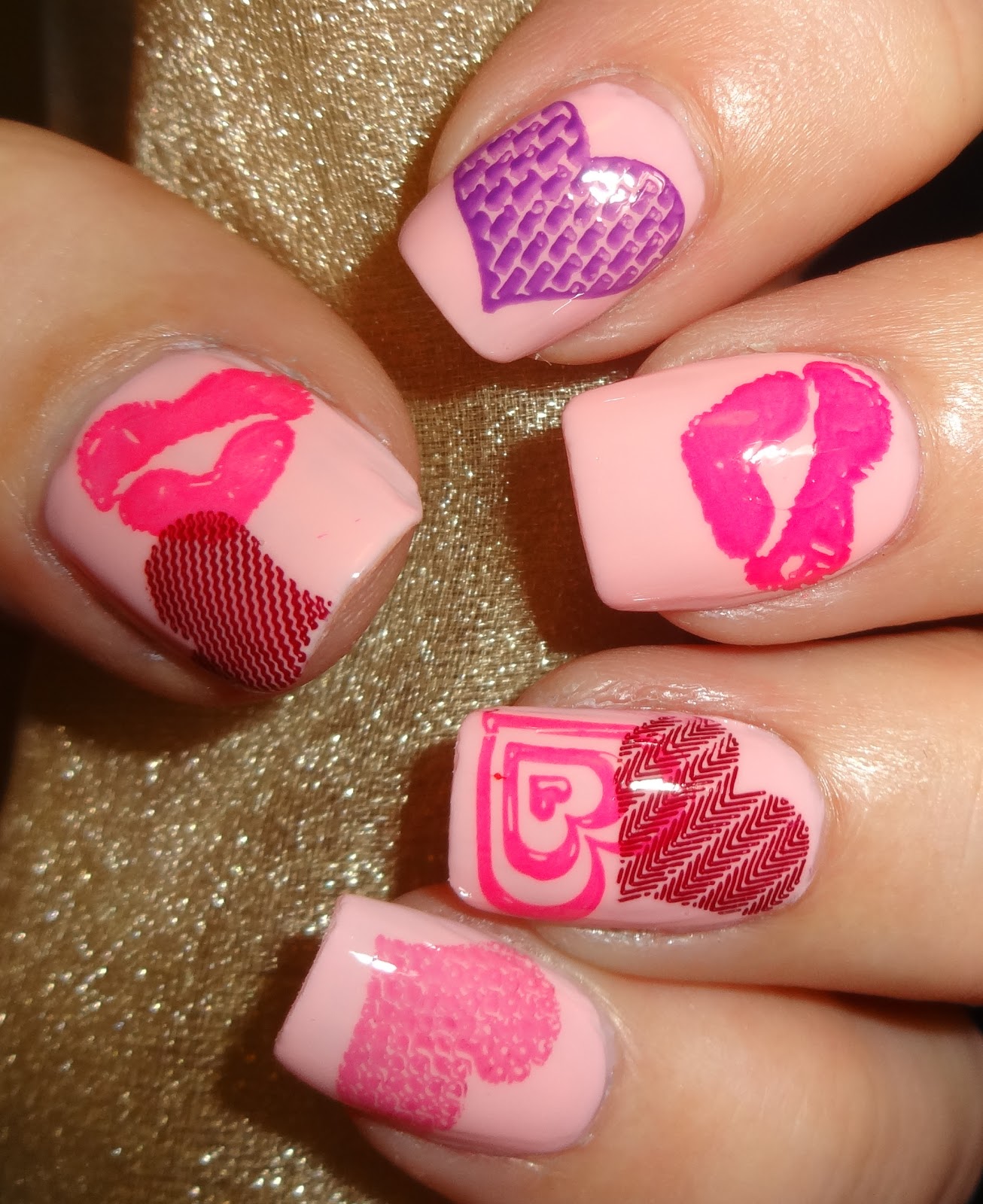 For my pink heart mani on the left I've used MoYou Nails stamping polishes Burgundy, Royal Purple, Razzle Dazzle Rose & Shocking Pink