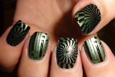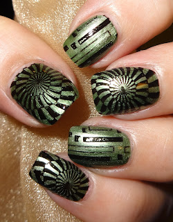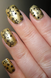 For my 2 manis I used shimmer polishes for the base and stamped in black. The green shimmer mani on the left combines both the rectangle and block circle pattern and the gold shimmer mani on the right is with the stars.