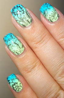 Pattern #29 are full cover black outlined flowers & leaves which I placed on top of a lime green and bright blue sponged base. Because the patterns are a generous size there's plenty for one full mani and the rest can be used for accent nails.