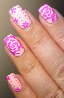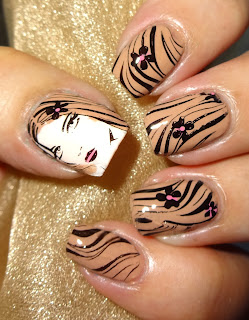 A first for me - reverse stamping using Pueen Stamping plate 70. The plate includes the face of a beautiful girl with long flowing hair and flowers. And I'm pretty chuffed with my 1st attempt of reverse staming. I stamped the girls face in black and left the image on the stamper. I painted her face a pale pink, added a touch of bright pink to her lips, painted her hair brown and added a pink dot at the centre of the flowers in her hair. I then covered with top coat and let it dry. I painted my thumb nail white and added top coat. While the top coat was still wet I peeled the dried stamped image from the stamper and applied to my nail. My first mani is around the girl and her hair. My second mani is using the flowers. Two very different designs from one plate and I've now achieved reverse stamping - yay!