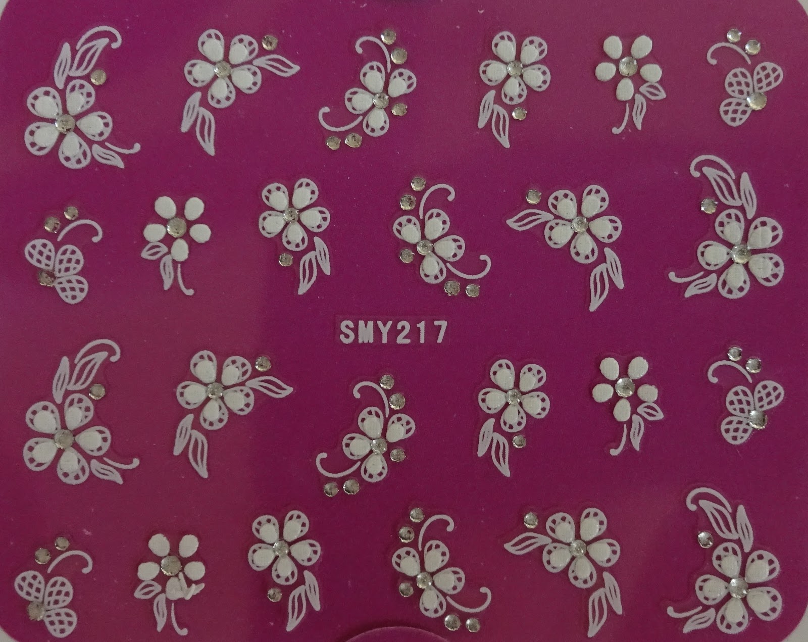 There are a total of 24 individual stickers. Beautiful white flower and butterfly nail art decals with clear rhinestones.