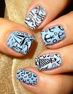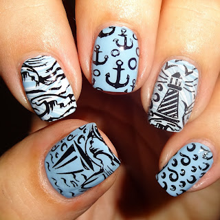 Pueen Stamping plate 96 is a nautical /coastal theme with boats, anchors, sea shells & waves and is available at Sparkly Nails. I used black stamping polish over blue nails with the index and ring finger nail being blue & white water marble.