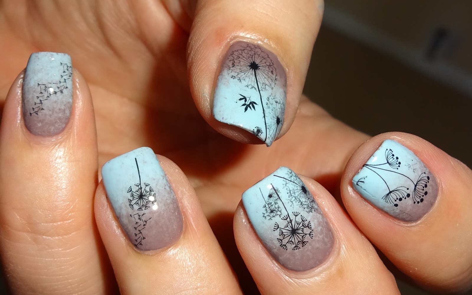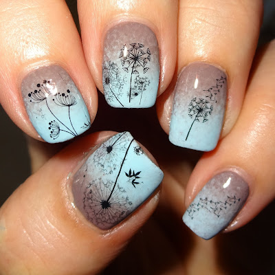 The days are becoming warmer and lighter for longer, we are well and truly into Spring. And that means everything in the garden is coming to life and starting to grow....including weeds. The Dandelion with its bright yellow flowers which turn into fluffy seed heads, a puff of wind and they fly into the air like little fairies. Onto today's mani, using Dandelion Water Decals from Charlies Nail Art over a dusky pink and sky blue gradient base. If you've not tried water decals before, give them a go, simply soak in a little water, remove from the backing paper, apply to your painted nails and seal with top coat - done!