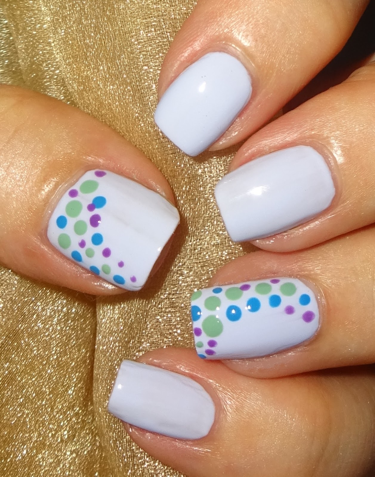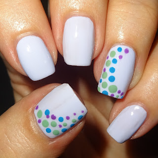 I like the blue and purple mani. I love how the dots form that sideswipe swirl pattern.