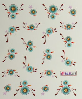 Today's mani is a white shimmer base topped with turquoise Flower Water Decals. There are 20 flower decals per pack in various sizes. The flowers have yellow centres with white and tan coloured leaves and are available from Nail Art UK. The decals will look great over lots of light to medium shades.