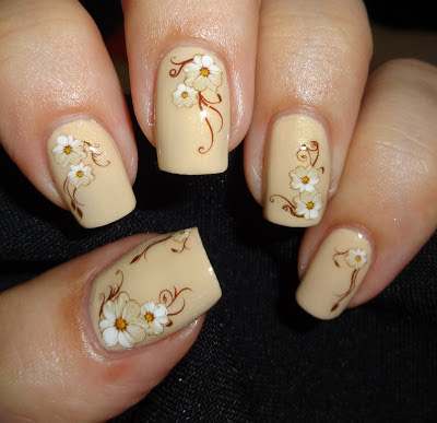 If you've not tried water decals before and always wanted to have a go, here's a mini tutorial on how to apply them. In this pack are 20 delicate white & beige flowers with brown swirls and I used a different flower on each nail.