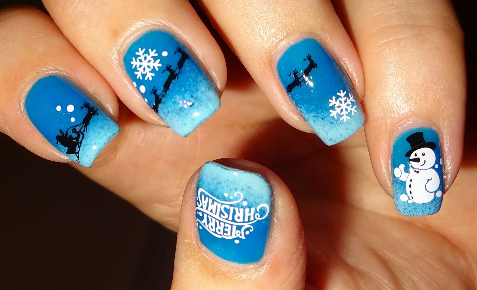 Today's mani is using Sleigh Ride water decals from Sparkly Nails applied over a blue gradient base. There are 17 decals in the pack, which includes Santa riding his sleigh, reindeer, snowmen and Merry Christmas wording.