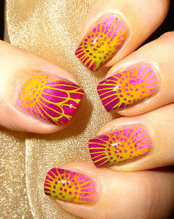 For above and below I used a fluorescent yellow base nail polish which lights up under a UV lamp and looks very effective and the stamped pattern really pops.